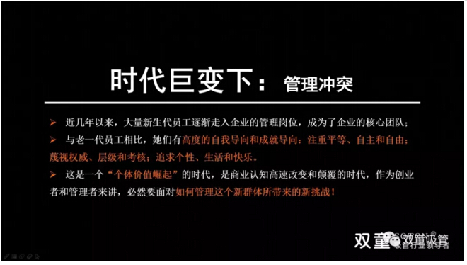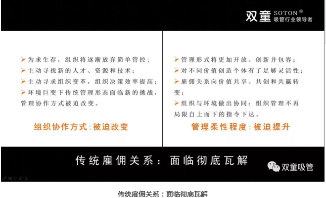 與此同時,民企也面臨著“經(jīng)理人老化”、“企業(yè)二代傳承”兩座大山。在這樣的新時代背景下,管理進入了信息管理時代,傳統(tǒng)雇傭關系面臨瓦解,管理協(xié)作方式改變,管理柔性程度被迫提升,員工與組織的雇傭關系逐漸變成了共生關系!管理形式將更加開放、創(chuàng)新并包容,對不同價值創(chuàng)造的個體就需要有足夠的靈活性,傳統(tǒng)雇傭關系逐漸向價值共享、共創(chuàng)和共贏轉變!