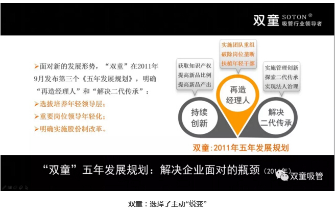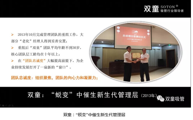 “雙童”選擇了主動“蛻變”:基于上述瓶頸,公司在2011年發(fā)布了第三個《企業(yè)五年發(fā)展規(guī)劃》,明確“再造經(jīng)理人”計劃,明確領導層更替:選拔培養(yǎng)年輕領導層、重要崗位領導年輕化、明確實施股份制改革,慢慢解決管理層老化問題!重組后的“雙童”團隊平均年齡不到三十歲,大部分核心團隊的工齡在十年以上,學歷、知識層次和忠誠度大幅提高!