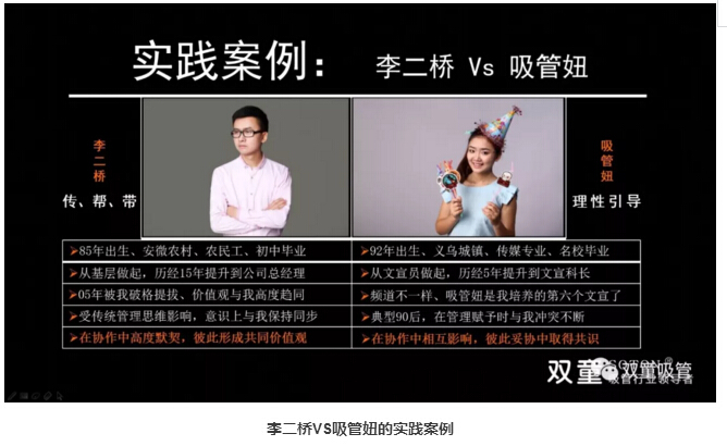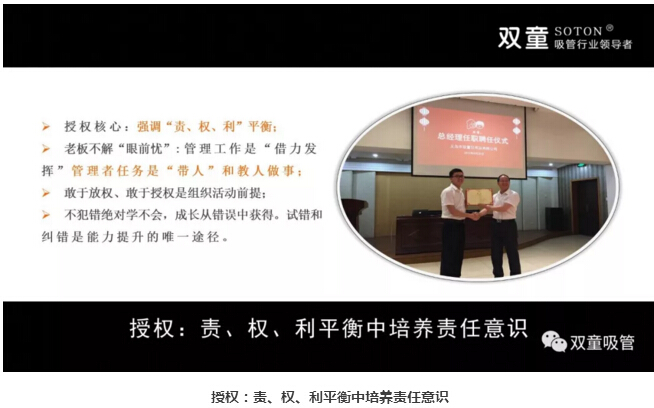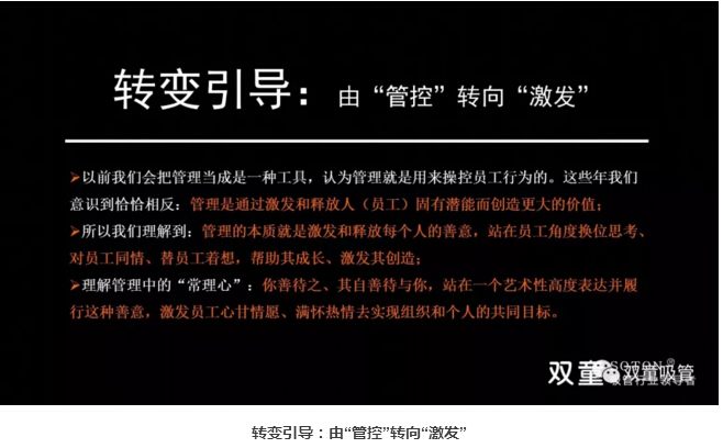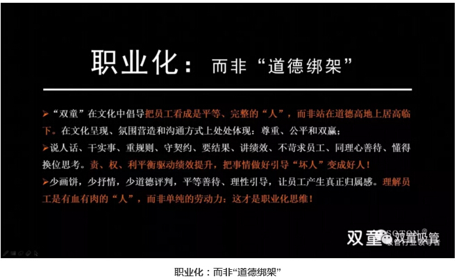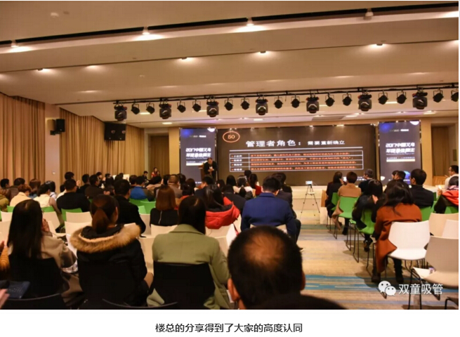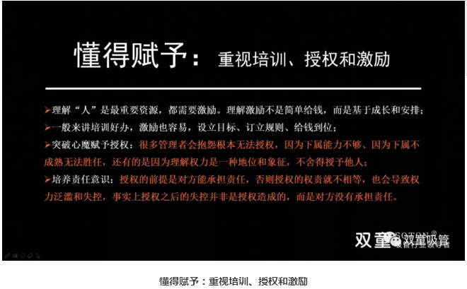 懂得賦予:重視培訓、授權和激勵:接下來,樓仲平也和大家分享了管理者要理解“人”是最重要的資源,都需要激勵。“雙童”通過學習會意識引導,將員工的學習與職業(yè)升遷掛鉤,將年度學習成績列入其長期職業(yè)發(fā)展當中。在“雙童”,敢于放權、敢于授權,我們認為員工試錯和糾錯是能力提升的唯一途徑。同時,“雙童”在文化呈現(xiàn)、氛圍營造和溝通方式上處處體現(xiàn):尊重、公平和雙贏,說人話、干實事、重規(guī)則、守契約、要結果、講績效、不苛求員工、同理心善待、懂得換位思考,責、權、利平衡驅動績效提升,讓員工把事情做好引導“壞人”變成好人!