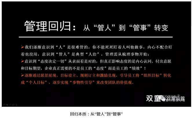 管理的本質是“管事”而非“管人”:很多管理者把管理當成一種工具,認為管理是用來操控的,就必須操縱控制員工的行為。其實,“人”是很難管的,你不能死死盯著一個人叫他做事情,員工內心不配合盯著他也沒有成效,“管人”是典型“人治”,真正的管理從梳理事物開始。所以,管理不是管控、教條和賦予,而是激發(fā)和釋放每個人的善意,幫助員工成長、激發(fā)其創(chuàng)造,在共同追求中形成一致的價值和理念認同。
