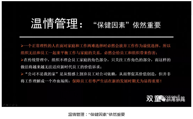 除了授權和激勵之外,“保健因素”依然重要。一個正常理性的人在面對家庭和工作兩難選擇時必然會放棄工作作為最優(yōu)選擇。“公司不是我的家”是從情感上割棄員工對公司依賴,從而督促其價值創(chuàng)造,但并非將工作理解成一個冷血場所:保障員工有尊嚴生活在新的發(fā)展時期尤為顯得重要!