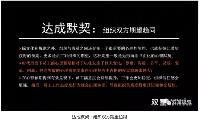 達成默契,組織雙方的期望趨同:除了文化和規(guī)則之外,組織與成員之間還存在一個很重要的心理性契約,也就是彼此希望獲得的預期,更多的是員工對組織的期望。