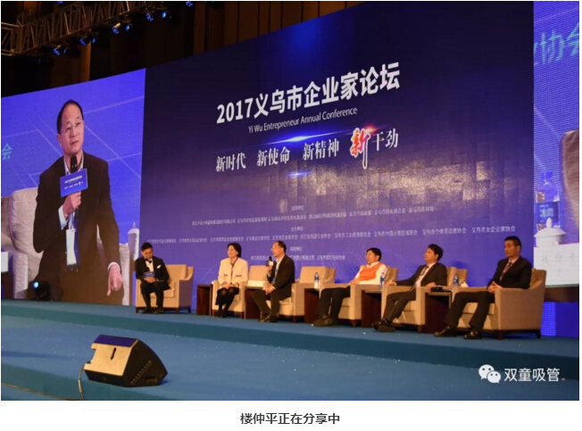 在最受矚目的企業(yè)家分享環(huán)節(jié),“雙童”樓仲平與義烏新光控股集團(tuán)董事長(zhǎng)周曉光、義烏浪莎襪業(yè)有限公司董事長(zhǎng)翁榮金、義烏華鴻控股集團(tuán)有限公司董事長(zhǎng)龔品忠、義烏小微企業(yè)代表黃洪鳴這幾位義烏企業(yè)界大咖被邀上臺(tái),共同分享了他們的2017年收獲以及2018年的展望!