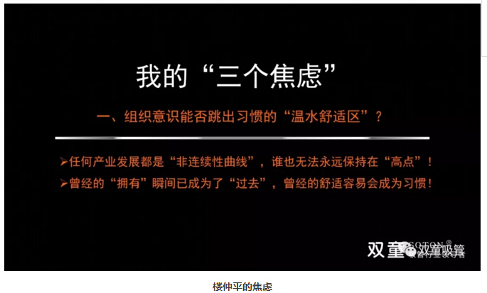 現(xiàn)在的樓仲平不抽煙,不喝酒,只有喝咖啡一個小小的嗜好,連喝茶對他來說都是過分消磨時間的奢侈之事。眼下,他最關(guān)心的是如何應(yīng)對“雙童的“三大焦慮”,在舒適區(qū)陷阱與產(chǎn)業(yè)瓶頸之外,個人夢想與組織夢想的沖突是第三大焦慮的來源,樓仲平面臨再次突破。