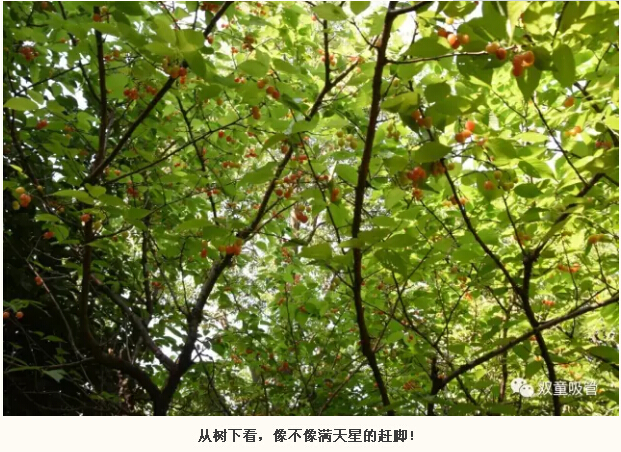 櫻桃樹(shù)上綴滿(mǎn)了待熟的櫻桃果,在茂密的櫻葉掩映下慢慢“紅了臉”,散發(fā)出陣陣誘人果香。從樹(shù)下往上看,像不像星星掛滿(mǎn)天的趕腳?