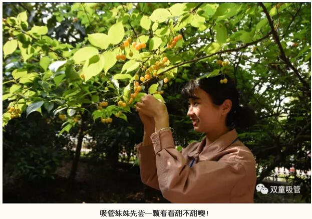 如此誘人的櫻桃,吃貨們當(dāng)然待不住啦!吸管妞和吸管妹妹們作為“雙童”專(zhuān)業(yè)吃貨當(dāng)然要先去幫大家嘗嘗味道啦!從樹(shù)上摘下櫻桃,直接丟進(jìn)嘴里,真是甜到了心坎里,忍不住吃了一顆又一顆,還有哪種新鮮比得上這樣現(xiàn)采品嘗呢!
