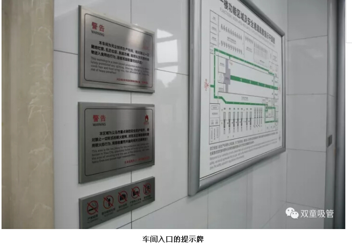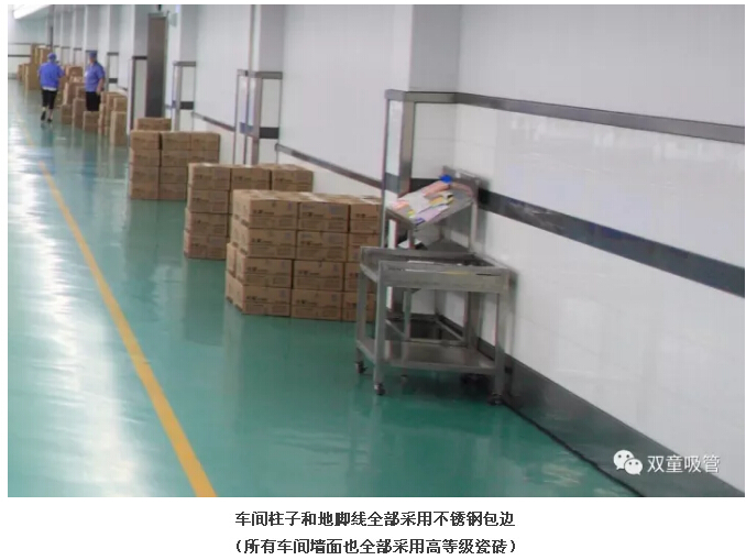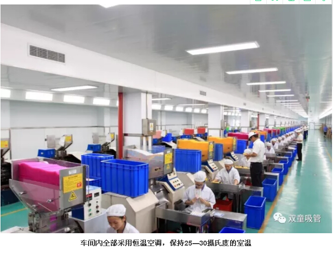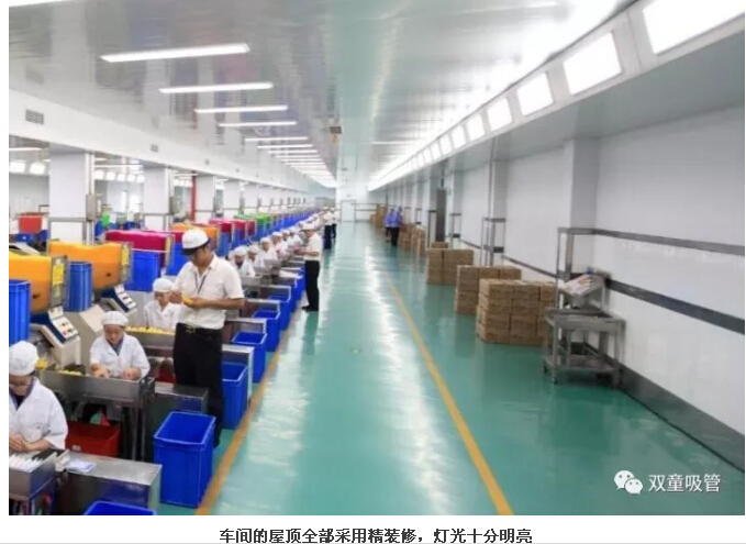 “雙童”車間的每個入口,有著許多安全、衛(wèi)生提示的標(biāo)牌,引導(dǎo)員工門在進入車間時要注意安全和衛(wèi)生防護工作。進入車間內(nèi)部,一列列整齊的機器、一箱箱五顏六色的吸管、一條條清晰分明的分界線,車間內(nèi)全部安裝了恒溫空調(diào),屋頂全部進行精裝修寬敞明亮,柱子和地腳線用不銹鋼進行包邊,大大增加了建筑年限。所有員工皆穿著潔白的工作服,正在忙碌地進行生產(chǎn)工作。