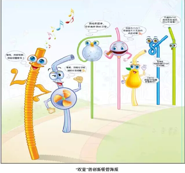 2006年,“雙童”開發(fā)的藝術(shù)吸管,原先是手工操作,“雙童”通過四年的努力研發(fā)機(jī)器設(shè)備,并開發(fā)出了全自動生產(chǎn)流水線,在2009年5月實現(xiàn)量產(chǎn),投入生產(chǎn)。截止到目前,“雙童”的藝術(shù)吸管占有了國內(nèi)市場的半邊江山,實現(xiàn)了“雙童”近1/4的產(chǎn)值。除此之外,“雙童”還研發(fā)了愛心吸管、眼鏡吸管等創(chuàng)新吸管,在市場上引發(fā)了極大的關(guān)注,塑造了品類多樣、敢于創(chuàng)新的企業(yè)品牌。至此,吸管不僅僅用來喝飲料了!