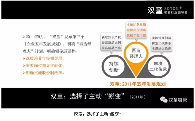 公司創(chuàng)辦初期聘任部分原國營企業(yè)的下崗管理層,這些人客觀上在企業(yè)發(fā)展中做出了巨大的貢獻(xiàn)。但2010年前后,其中的大部分管理層逐漸出現(xiàn)了“認(rèn)知時間軸瓶頸”,他們完全憑經(jīng)驗用老方法解決新問題,拒絕接受和應(yīng)用新興事物,團(tuán)隊的成長遇到了瓶頸。因此,“雙童”決定重新梳理團(tuán)隊,在2011年發(fā)布了第三個《企業(yè)五年發(fā)展規(guī)劃》,明確“再造經(jīng)理人”計劃,明確領(lǐng)導(dǎo)層更替:選拔培養(yǎng)年輕領(lǐng)導(dǎo)層、重要崗位領(lǐng)導(dǎo)年輕化、明確實施股份制改革,慢慢解決管理層老化問題!重組后的“雙童”團(tuán)隊平均年齡不到三十歲,大部分核心團(tuán)隊的工齡在十年以上,學(xué)歷、知識層次和忠誠度大幅提高!
