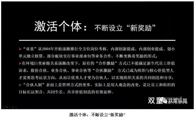 激活組織的同時,“雙童”也在激活個體上絞盡腦汁,不斷設(shè)置“新獎勵”。公司從2004年開始逐漸推行全方位崗位考核、內(nèi)部創(chuàng)新提成、內(nèi)部創(chuàng)業(yè)提成、劃小單元獨立核算、部分板塊實行事業(yè)部承包等業(yè)務(wù)合作,不斷變換著獎勵的形式。同時,股份合伙、業(yè)務(wù)合伙、事業(yè)合伙等“合伙激勵” 方式已成為組織與核心價值型人才需要思考遠(yuǎn)景方向,從而讓優(yōu)秀人才變?yōu)楹匣锶?,以實現(xiàn)組織關(guān)系的共同創(chuàng)造和分享!