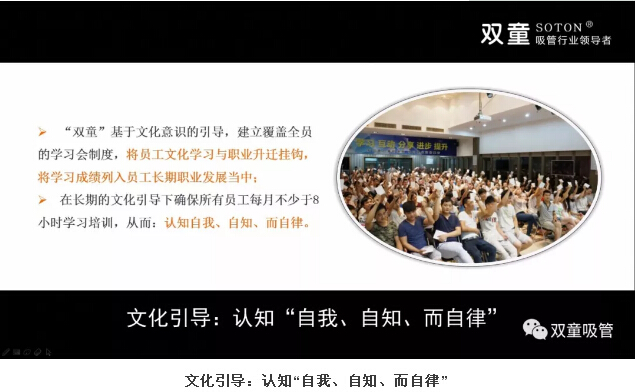 從企業(yè)經(jīng)營(yíng)的角度來(lái)說(shuō),“雙童”就極為重視“文化載體”的維護(hù)和調(diào)整,建立了以“價(jià)值觀傳播”、“閃亮點(diǎn)傳播”、“自媒體傳播”的文化傳播體系。如:“雙童”基于文化意識(shí)的引導(dǎo),建立覆蓋全員的學(xué)習(xí)會(huì)制度。在長(zhǎng)期的文化引導(dǎo)下確保所有員工每月不少于8小時(shí)學(xué)習(xí)培訓(xùn),從而引導(dǎo)員工們認(rèn)知自我、自知、而達(dá)到自律。