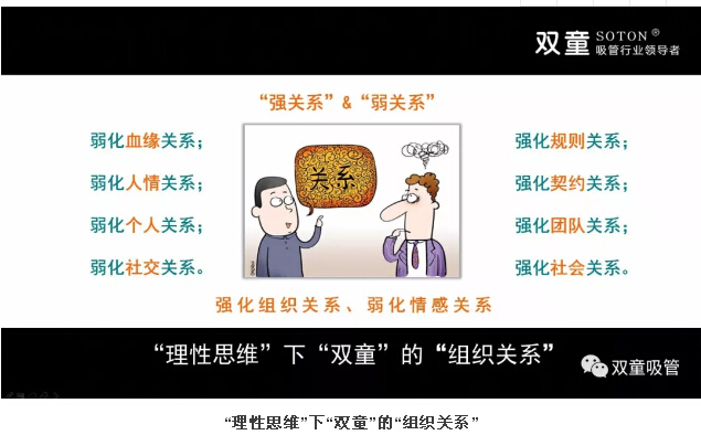 受到西方“理性思維”的影響和推動(dòng),“雙童”創(chuàng)立了一套組織關(guān)系哲學(xué),用來(lái)弱化血緣關(guān)系,強(qiáng)化規(guī)則關(guān)系;弱化人情關(guān)系,強(qiáng)化契約關(guān)系……