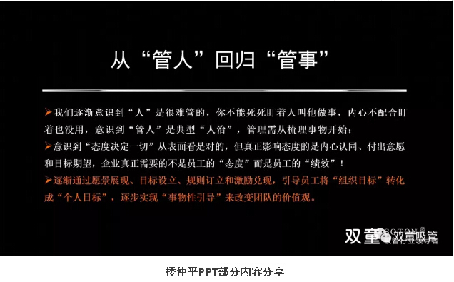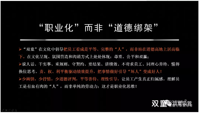 在“理性”思維的持續(xù)引導(dǎo)下,“雙童”在文化中倡導(dǎo)把員工看成是平等、完整的“人”,而非站在道德高地上居高臨下。在“雙童”的文化呈現(xiàn)、氛圍營(yíng)造和溝通方式上,處處體現(xiàn)了“理性”思維,通過(guò)愿景展現(xiàn)、目標(biāo)設(shè)立、規(guī)則訂立和激勵(lì)兌現(xiàn),引導(dǎo)員工將“組織目標(biāo)”轉(zhuǎn)化成“個(gè)人目標(biāo)”,逐步實(shí)現(xiàn)“事物性引導(dǎo)”來(lái)改變團(tuán)隊(duì)的價(jià)值觀。所以,管理不是管控、教條和賦予,而是激發(fā)和釋放每個(gè)人的善意,幫助員工成長(zhǎng)、激發(fā)其創(chuàng)造,在共同追求中形成一致的價(jià)值和理念認(rèn)同。