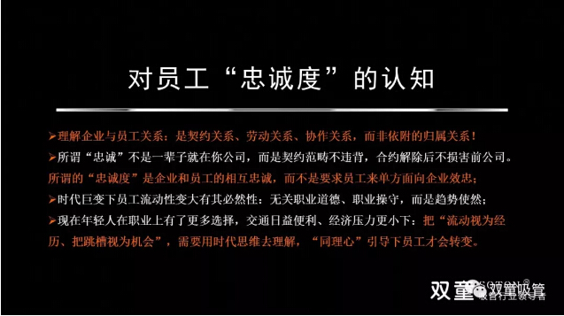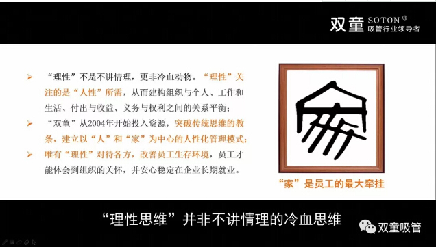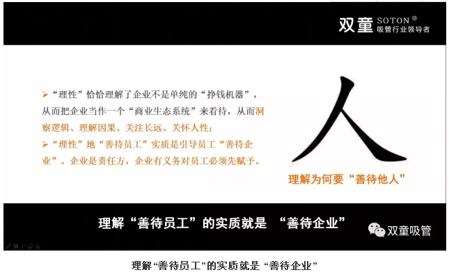 需要注意的是,所謂的“理性經(jīng)營(yíng)”絕非是不講情理,更非冷血?jiǎng)游铩袄硇浴标P(guān)注的是“人性”所需,“雙童”建立以“人”和“家”為中心的人性化管理模式,“理性”地“善待員工”,實(shí)質(zhì)是引導(dǎo)員工“善待企業(yè)”。