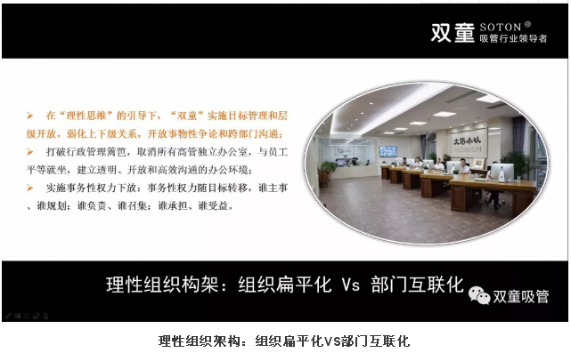 在“理性思維”的持續(xù)引導(dǎo)下,“雙童”實(shí)施目標(biāo)管理和層級(jí)開(kāi)放,弱化上下級(jí)關(guān)系,開(kāi)放事務(wù)性爭(zhēng)論和跨部門(mén)溝通;打破行政管理籬笆,取消所有高管獨(dú)立辦公室,與員工平等就坐,建立透明、開(kāi)放和高效溝通的辦公環(huán)境;實(shí)施事務(wù)性權(quán)力隨目標(biāo)轉(zhuǎn)移,誰(shuí)主事、誰(shuí)規(guī)劃;誰(shuí)負(fù)責(zé)、誰(shuí)召集;誰(shuí)承擔(dān)、誰(shuí)受益。