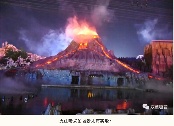 到了晚上7點30分,精彩的表演開始了!高35米的火山在漆黑的夜幕中突然爆發(fā),熱浪沖天,火山熔巖漿滾滾而下…… 整個演出使用了激光高科技,將水面和空中演繹的若夢若幻,美輪美奐,讓大家震撼到贊不絕口!