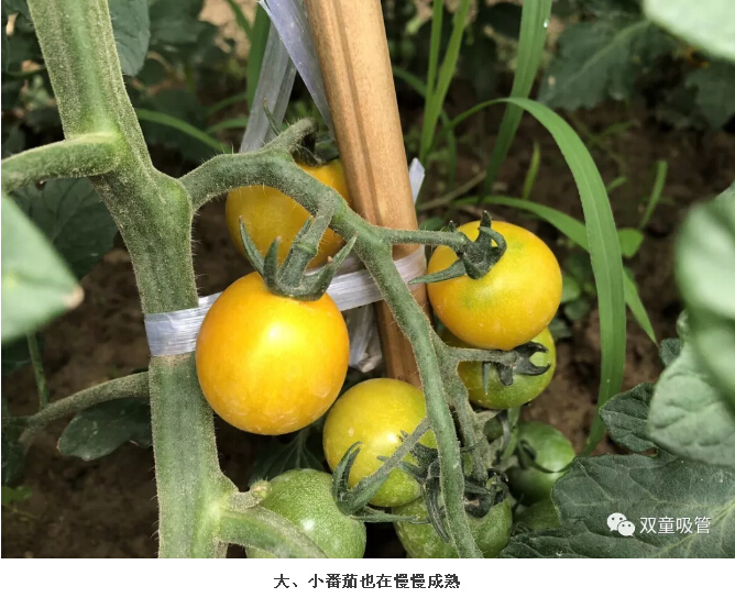 除了黃瓜之外,菜園中的番茄也是一道靚麗的風(fēng)景哦!瞧,一根藤上冒出好幾個(gè)番茄,大的,小的......摘了一顆放在嘴里,香甜鮮美,別有一番味道呢!