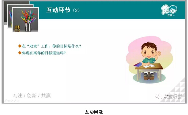首先,吸管妞拋出了兩個互動問題:“想象你是自己的上級,請你給自己打個分”、“在‘雙童’工作,你的目標是什么?你現(xiàn)在離你的目標遙遠嗎?” 通過這兩個互動問題,讓大家思考自身是否有不足,如何努力才能達到自己的目標。