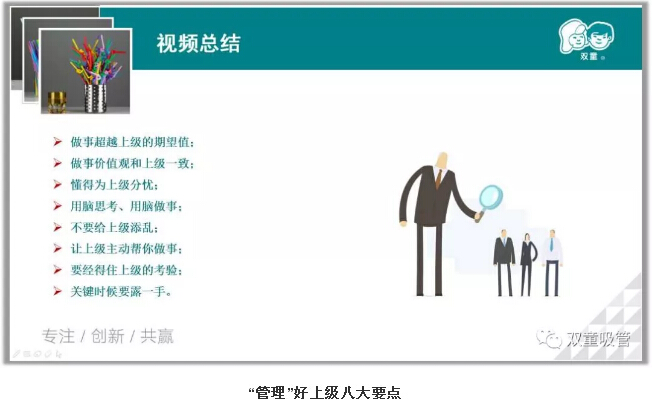接下來,吸管妞帶領(lǐng)大家一起觀看了課程視頻《如何管理好你的上級》!在視頻中,我們了解到:在職場中,與你的上級建立起相互尊重理解的關(guān)系,會對你的工作起到至關(guān)重要的作用!那么,我們應該如何反向“管理”上級呢?