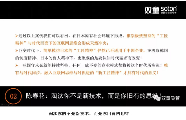 樓仲平也引導(dǎo)現(xiàn)場創(chuàng)業(yè)者們:日本原有社會環(huán)境下形成、推崇極致堅(jiān)持的‘工匠精神’與時(shí)代巨變下的互聯(lián)網(wǎng)思維形成了天然沖突!巨變時(shí)代下,簡單模仿日本的‘工匠精神’儼然已不適用于中國企業(yè),在汲取德國的制度精神、日本的哲人精神下,更重要的是要認(rèn)知時(shí)代需求而改變!‘工匠精神’也需要與時(shí)俱進(jìn),唯有與時(shí)代同步,融入互聯(lián)網(wǎng)思維與時(shí)俱進(jìn)的“新工匠精神”才具有時(shí)代的意義!