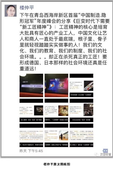 “工匠精神’的核心是培育大批具有‘匠心’的產(chǎn)業(yè)工人。但中國文化歷來注重‘學(xué)而優(yōu)則仕’,輕視商人和藝人。‘雙童’十多年來培養(yǎng)大學(xué)生下基層的努力幾乎完全失??!反思當(dāng)下,我們的文化、我們的教育、我們的制度、我們的社會環(huán)境……我們要形成德國、日本那樣的社會環(huán)境還真是任重道遠(yuǎn)!”一席話下來,也引起現(xiàn)場觀眾對“工匠精神”的極大反思!