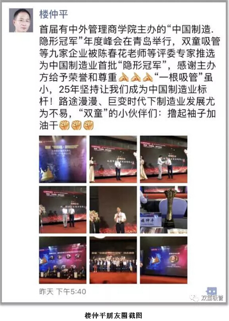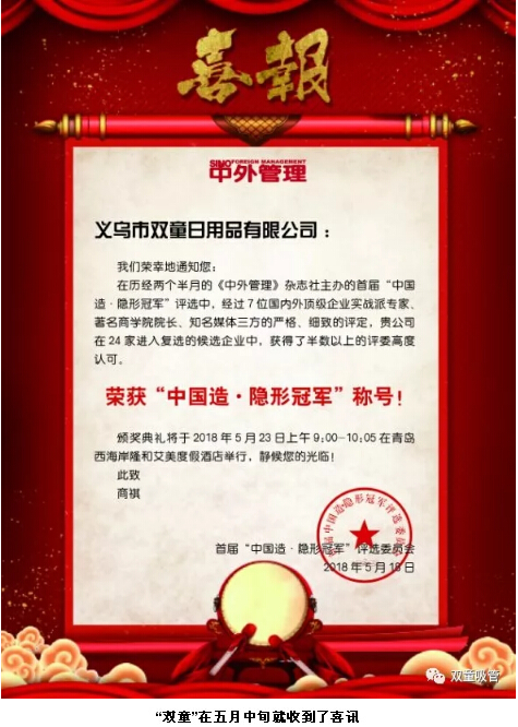 據(jù)悉,此次“中國造·隱形冠軍”評選有全國各地24家企業(yè)入圍,經(jīng)過北京大學(xué)國發(fā)院BiMBA商學(xué)院院長陳春花教授等七位評委專家的評選,共有9家企業(yè)脫穎而出,被推選為首批“中國造·隱形冠軍”。首批實(shí)至名歸的“中國造·隱形冠軍”企業(yè)代表上臺領(lǐng)獎(jiǎng),接受官產(chǎn)學(xué)媒各界的掌聲!“雙童”也名列其中!