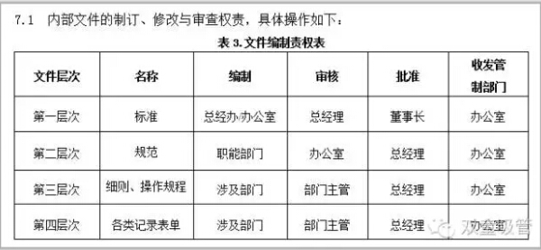 第二層次文件:本公司內(nèi)部的職能部門之間對某一活動的聯(lián)系方式的描述,有關(guān)經(jīng)營管理活動步驟的規(guī)范;
