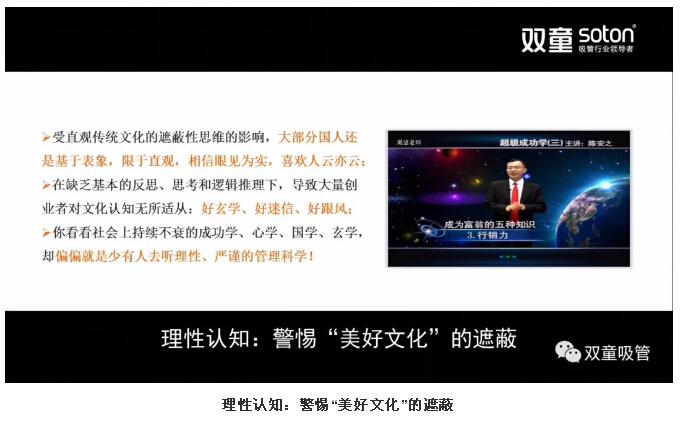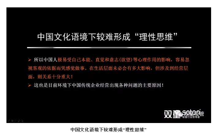 商業(yè)文明來(lái)源于西方,我們所從事的創(chuàng)業(yè)、經(jīng)營(yíng)和管理均屬于西方理性科學(xué)。因此,在西方體系下的商業(yè)經(jīng)營(yíng)活動(dòng),用純中方的感性思維是解決不了問(wèn)題的,兩種文化間一定會(huì)產(chǎn)生對(duì)抗!所以,作為創(chuàng)業(yè)者或管理者來(lái)講,我們也要開(kāi)放自己的思維,突破思維遮蔽,不斷調(diào)整自己的思想狀態(tài)和文化結(jié)構(gòu),否則你永遠(yuǎn)處在堅(jiān)殼當(dāng)中而深受戕害!