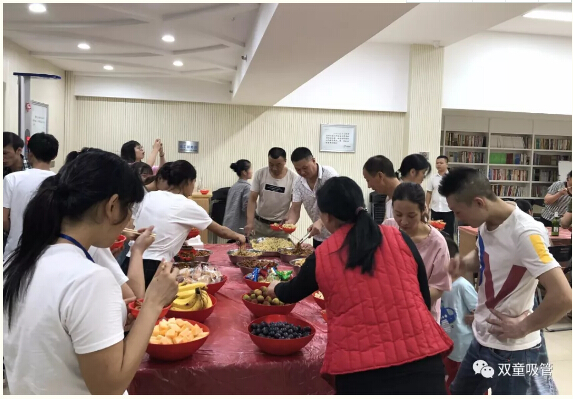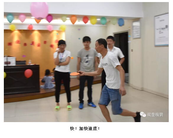 “比比誰(shuí)更快?”可是團(tuán)隊(duì)游戲哦,考驗(yàn)的是大家的默契程度!瞧,第一位出戰(zhàn)者剛運(yùn)送完乒乓球,第二位就開始吃西瓜、第三位馬上用眼鏡吸管喝飲料啦…… 最快的團(tuán)隊(duì)僅僅用了兩分鐘就完成了游戲,大家真是默契十足呀!