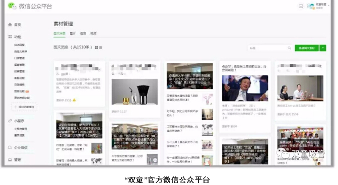 如今,“雙童”專門設(shè)置有5人編制的文宣部門,負(fù)責(zé)運(yùn)營(yíng)微博、微信、官方網(wǎng)站、今日頭條等十幾個(gè)自媒體應(yīng)用平臺(tái),整體流量和社會(huì)關(guān)注度位于中國(guó)制造業(yè)前列!