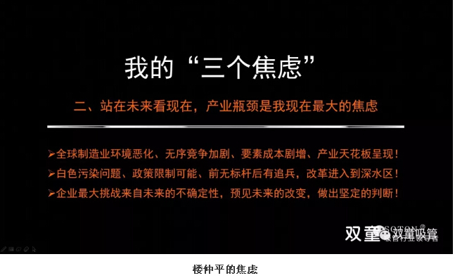 “同時(shí),在這個(gè)高度變化的時(shí)代,企業(yè)最大挑戰(zhàn)來自未來的不確定性,制造業(yè)從1.0到4.0,‘雙童’離‘天花板’瓶頸也越來越近,這就是我們的焦慮。作為創(chuàng)業(yè)者來說,我要真正理解企業(yè)家精神,理解創(chuàng)業(yè)者需要思考的下一個(gè)維度,從而遇見未來的改變,做出堅(jiān)定的判斷?!?/span>