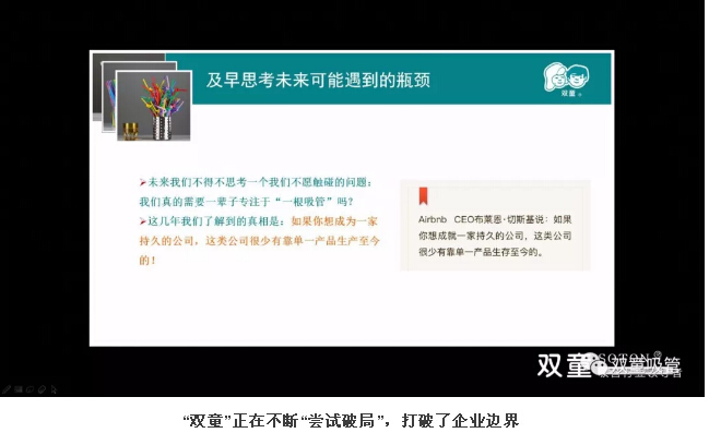 基于這樣的思考,“雙童”正在不斷“嘗試破局”。2016年9月,“雙童”發(fā)布了第四個(gè)《五年發(fā)展規(guī)劃》,但僅僅半年時(shí)間,我們對(duì)未來戰(zhàn)略進(jìn)行調(diào)整,對(duì)《五年發(fā)展規(guī)劃》進(jìn)行重新修訂,乃至于將《經(jīng)營(yíng)哲學(xué)》中“五十年專注一根吸管”的理念刪除,去買土地建廠房為年輕人創(chuàng)造一個(gè)新的創(chuàng)業(yè)平臺(tái),以打破企業(yè)的邊界!