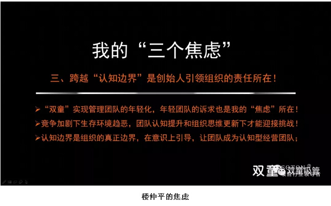 樓仲平的第三個(gè)焦慮:2011年,“雙童”明確“再造經(jīng)理人”計(jì)劃,選拔培養(yǎng)年輕領(lǐng)導(dǎo)層,管理團(tuán)隊(duì)更加年輕化,“雙童”管理團(tuán)隊(duì)也更加年輕、有斗志,有激情。但當(dāng)我看到這批年輕的管理團(tuán)隊(duì)臉上洋溢著對(duì)未來的期待、渴求和夢(mèng)想的時(shí)候,我明白他們現(xiàn)在正“嗷嗷待哺”,我需要給他們創(chuàng)造更大的空間和更廣闊的平臺(tái),我產(chǎn)生了無限的壓力和焦慮。我要思考如何創(chuàng)造空間,讓他們實(shí)現(xiàn)更大的夢(mèng)想,我不能讓我的邊界限制企業(yè)的未來十年,不能讓我的邊界限制年輕有為的管理團(tuán)隊(duì)!