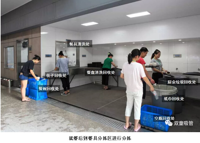 4、員工來到餐具分揀區(qū),將餐余垃圾、餐巾紙、飲料瓶、筷子、餐碗等分揀完畢,最后將餐盤清洗干凈疊放好即可!