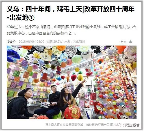 近日,著名原創(chuàng)財經(jīng)新媒體——“界面新聞”發(fā)出了《義烏四十年間:雞毛上天|改革開放四十周年·出發(fā)地》的新聞,其中重點提及了樓仲平“雞毛換糖”的創(chuàng)業(yè)經(jīng)歷。下面,吸管妞就帶大家來看看吧!
