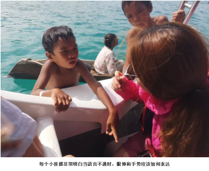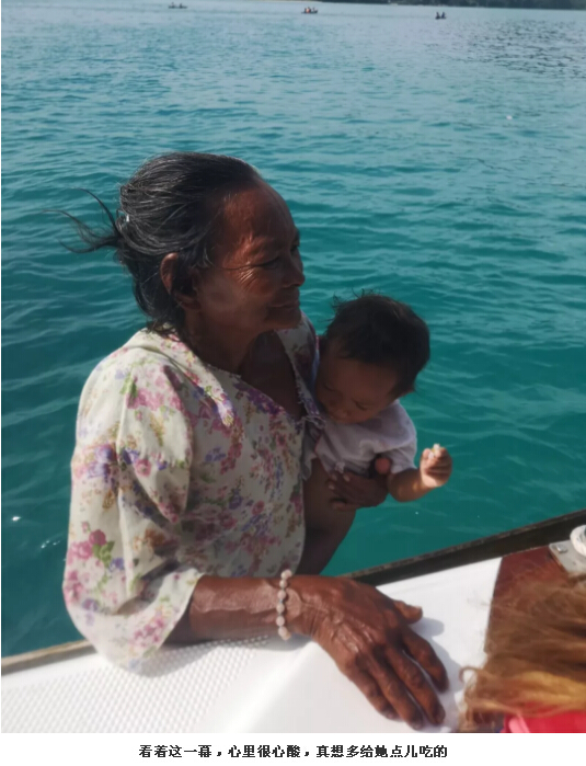 當(dāng)我們的快艇一放慢速度,我們就發(fā)現(xiàn)許多小船便快速朝著我們前進(jìn),說(shuō)實(shí)話(huà)心里還是很恐慌的。當(dāng)船慢慢靠近了以后發(fā)現(xiàn),船上基本上是老人、婦人,最多的是小孩,他們曬得黝黑黝黑的,女孩子臉上還涂著黃白色的泥巴,睜著大大的眼睛,不斷地用目光搜尋你身上有沒(méi)有他們想要的食物。一旦發(fā)現(xiàn),就賴(lài)著你,用央求的眼神可憐巴巴地指著食物,希望你可以把食物分享給他們。我們翻遍了包包,只找到一罐口香糖。姐姐拿出一顆想給一個(gè)小女孩,那個(gè)小女孩竟然搖搖頭,指著那個(gè)罐子表示她想要一罐??紤]到不確定他們能夠明白口香糖是要吐掉的,我們就拒絕了她的要求。小女孩也不生氣,央求了一段時(shí)間后,便轉(zhuǎn)移目標(biāo),指了指姐姐頭上戴著的花,想讓我們把花也給她。這怎么行,我們也只有一朵,還是買(mǎi)泳衣的時(shí)候送的,后續(xù)大家可以看到這朵花不斷地出現(xiàn)在我和姐姐的頭上,發(fā)揮了卓越的裝飾作用……捂臉。