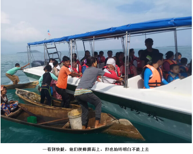 很快,我們到了第一個(gè)島——波德加亞島。負(fù)責(zé)介紹的“小黑”告訴我們,我們不需要上第一個(gè)島,主要是帶我們來(lái)看看世界上唯一一個(gè)沒(méi)有國(guó)籍的民族——巴瑤族。