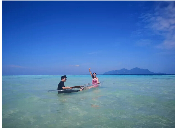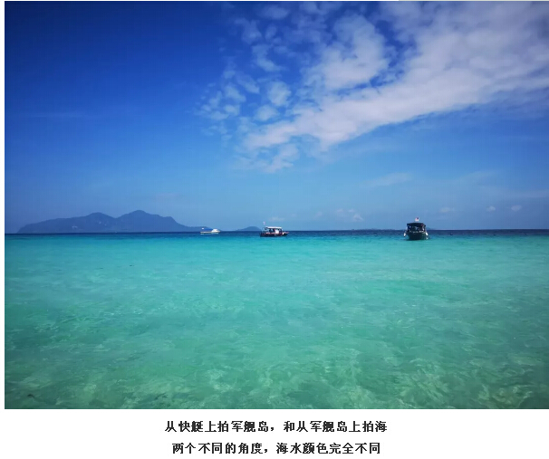 終于說(shuō)到第四個(gè)島,也是我們一致認(rèn)為四個(gè)島里最美的海島——軍艦島。這個(gè)島很小,以像一艘軍艦而得名,沙子又白又軟又細(xì),海水也非常清澈。小黑哥給我們準(zhǔn)備了玻璃船和大型水上玩具,我們盡情玩鬧,拍下了旅程中最美的海島照片。