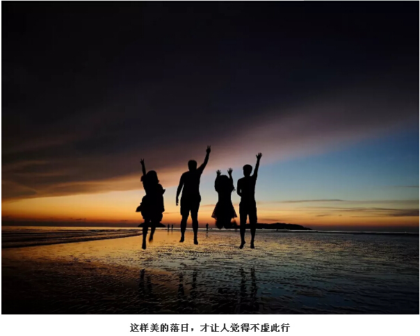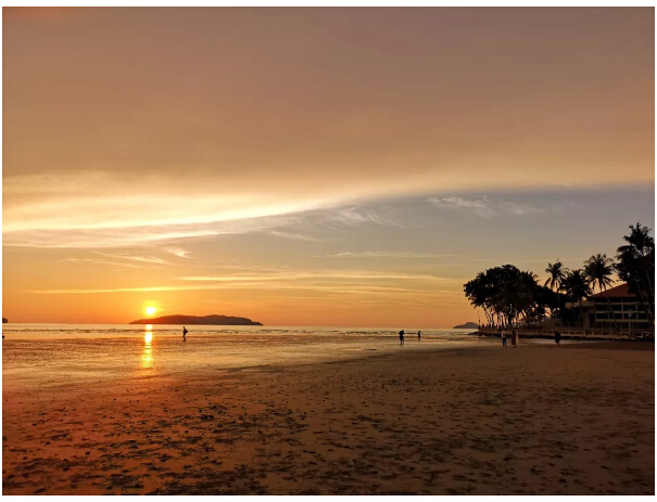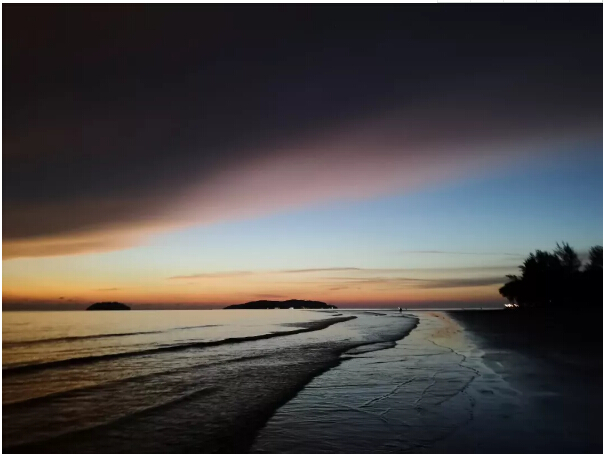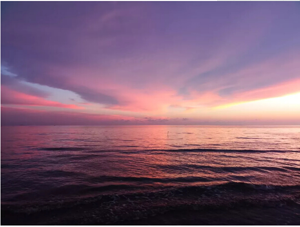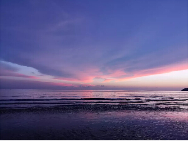 到了太陽(yáng)快下山時(shí),我們也回到了沙灘上。只見(jiàn)一輪紅日慢慢向山那邊落下去,云彩也被映襯得金黃金黃的,倒映在水中的光也讓人頭暈?zāi)垦#牪婚_(kāi)眼。沒(méi)幾分鐘,太陽(yáng)就下山了。就當(dāng)我們覺(jué)得“世界上最美的落日”也就是不過(guò)如此時(shí),神奇的事發(fā)生了!太陽(yáng)下山以后,刺眼的光芒也不見(jiàn)了,而留下來(lái)的云朵開(kāi)始了他們的表演,演變成了黃色、藍(lán)色、紫色,不斷變幻,像是打翻了顏料盤(pán)后幾種顏色混到了一起。瑰麗的云層壓得很低,似乎和大海連到了一起,海天一色。此情此景,讓每個(gè)人的心都變得柔軟起來(lái)。此時(shí)此刻,無(wú)語(yǔ)也溫暖,平凡也浪漫。