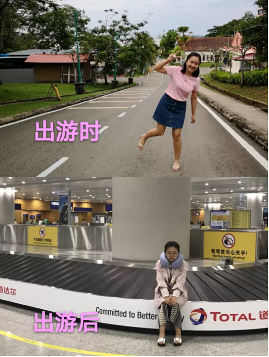 PS:最后說(shuō)一個(gè)小插曲,可能是冷熱交錯(cuò),或者吃錯(cuò)了什么東西,我是一路從亞庇機(jī)場(chǎng)肚子痛回了上海,再加上到達(dá)上海已經(jīng)是凌晨四點(diǎn),整個(gè)人都虛到不行。在上海機(jī)場(chǎng)呆等行李時(shí),姐姐竟然偷偷拍了一張我的照片,后面發(fā)給我時(shí)我自己都笑慘了。下面請(qǐng)欣賞一張本人“出游時(shí)”和“出游后”的對(duì)比照片: