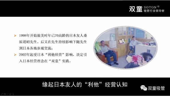 1998年,“雙童”樓仲平通過業(yè)務(wù)關(guān)系結(jié)識了一位旅美日本友人桑原道昭先生。桑原道昭先生在美國待了45年,會一點漢語。他會和樓仲平交流做生意的看法,并用日本人的視角和思想解讀節(jié)能環(huán)保、節(jié)約土地、員工關(guān)懷等方面的話題。在交流過程中,32歲的樓仲平與當(dāng)時已經(jīng)70歲高齡的桑原道昭先生成為了忘年交,此后便開啟了樓仲平不斷去日本參觀的學(xué)習(xí)之旅。在看過無數(shù)日本企業(yè)對自然環(huán)境、資源循環(huán)利用等方面的做法后,日本“利他”經(jīng)營的管理理念深深影響了樓仲平的商業(yè)思維。于是,當(dāng)2003年新建廠房的機(jī)會來臨,樓仲平便立志要將“雙童”建設(shè)為一個生態(tài)、環(huán)保、無污染、無排放的花園式工廠。
