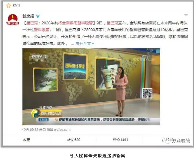 昨天下午,一則#星巴克將全面停用塑料吸管#的話題迅速登上了微博熱搜榜!中國(guó)日?qǐng)?bào)、新京報(bào)、第一財(cái)經(jīng)日?qǐng)?bào)等各大官V不斷跟進(jìn)這個(gè)話題,連央視也發(fā)了新聞,可謂是一“管”激起千層浪!