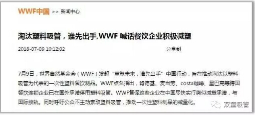 7月9日,世界自然基金會(WWF)發(fā)起“重塑未來,誰先出手”中國行動,旨在推動淘汰以塑料吸管為代表的一次性塑料餐飲制品。