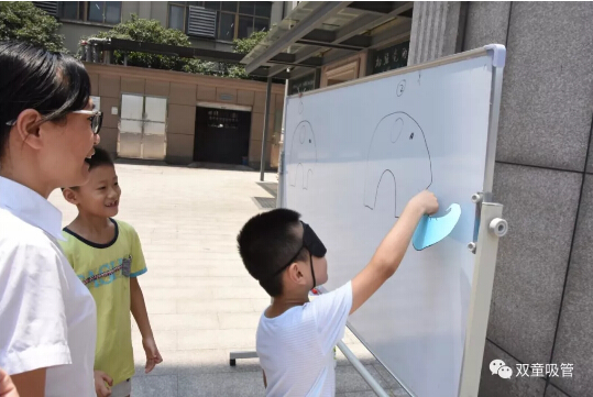 上午11:00,“雙童”的寶貝們和爸爸媽媽們一起玩游戲贏獎品!瞧,游戲的第一項(xiàng)就是“給小象貼鼻子”啦!爸爸媽媽們將寶貝們的眼睛蒙上,引導(dǎo)孩子將手中的“象鼻子”貼到正確的位置。