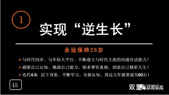 隨后,他也拿自身舉例,“雖然大家能看出來我的頭發(fā)都掉的差不多了,但是我一直把自己歸為‘新生代’創(chuàng)業(yè)者”,究其原因,是因?yàn)樵诋?dāng)今巨變時代下,創(chuàng)業(yè)更講究的是“心理年齡”,而非“生理年齡”。如果一個人的思維已經(jīng)落后,那么無論他生理上是幾歲,都已經(jīng)“老”了!