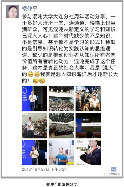 “雙童”樓仲平也在朋友圈感言:這個時代缺少的不是知識、不是信息、甚至都不是學(xué)習(xí)的形式!稀缺的是引導(dǎo)知識轉(zhuǎn)化為實(shí)踐認(rèn)知的思維通道、缺少的是推動創(chuàng)業(yè)者從知識所有者向價值所有者轉(zhuǎn)化動力!混沌完成了這個任務(wù),這才是真正的社會大學(xué)!