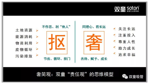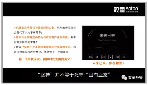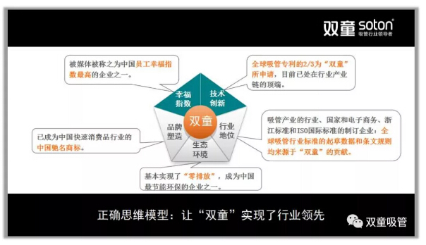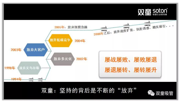 “雙童”堅持的背后也伴隨著不斷的放棄,放棄義烏市場、放棄多元化……2003年開始,“雙童”決定放棄繼續(xù)擴(kuò)張,放棄低端競爭,在原有的規(guī)模下改變商業(yè)模式,寧可盈利不做大,不要做大不盈利。但“雙童”堅持的是實業(yè)、是事業(yè)、而非某個單一產(chǎn)品!這個世界的發(fā)展是多元的,存在既有道理:也許五年十年后,“雙童”涉足其他領(lǐng)域已不再生產(chǎn)吸管!
