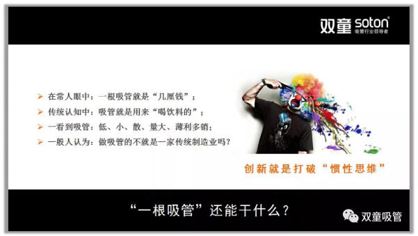 接著,樓仲平分享了:在傳統(tǒng)的認(rèn)知當(dāng)中,類似于塑料吸管這樣的產(chǎn)品門檻低,不起眼,是典型的“低、小、散、弱”傳統(tǒng)邊緣產(chǎn)品,很難做品牌。但“雙童”用創(chuàng)新的思維不斷努力,硬是把一個看似不可能的產(chǎn)品創(chuàng)造出大品牌,打破了吸管這類產(chǎn)品不能做品牌的傳統(tǒng)偏見!