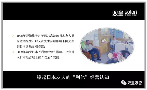 1997年10月,“雙童”樓仲平結(jié)識了已經(jīng)70歲的日本商人桑原道昭先生。桑原道昭在美國待過很多年,又會一點中文,他和樓仲平交流做生意的看法,并與他分享如何用日本人的視角和思想解讀節(jié)能環(huán)保、節(jié)約土地、如何對員工好。這些觀念讓樓仲平感到非常新鮮和好奇,他開始對日本民族的自律、謙虛和勤奮感到吃驚和敬佩。于是,當(dāng)時年僅32歲的他和70歲的桑原道昭成了忘年交,他們到日本各地拜訪客戶,參觀日本企業(yè),探究日本“利他經(jīng)營”。