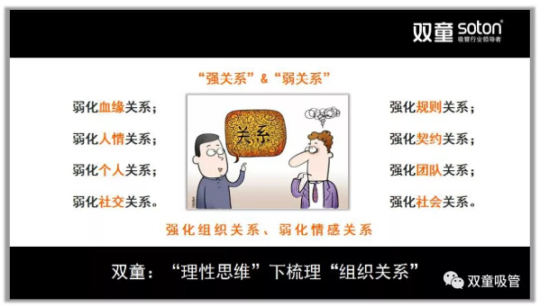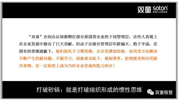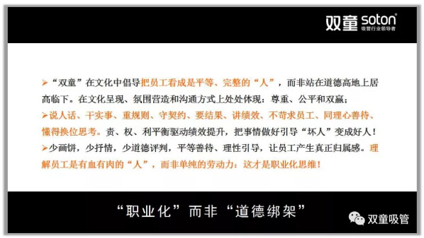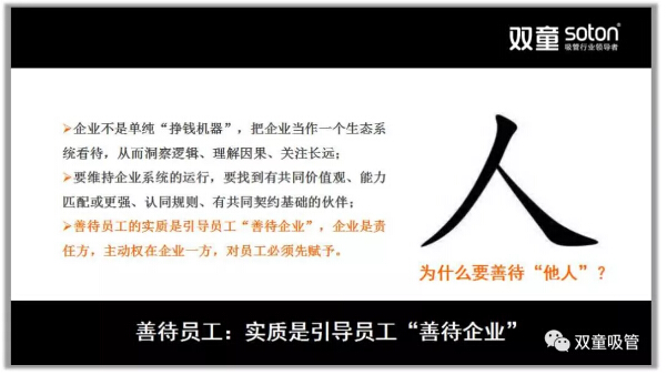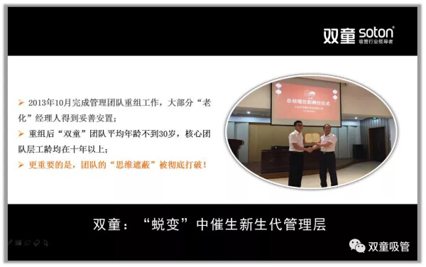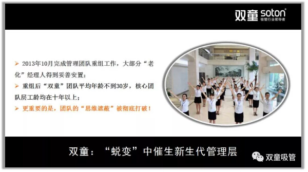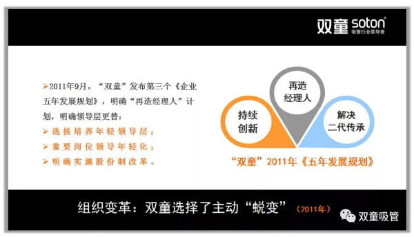 所以,在2011年9月,“雙童”發(fā)布了第二個《企業(yè)五年發(fā)展規(guī)劃》,明確“再造經(jīng)理人”計劃,明確領(lǐng)導(dǎo)層更替:選拔培養(yǎng)年輕領(lǐng)導(dǎo)層、重要崗位領(lǐng)導(dǎo)年輕化、明確實施股份制改革,慢慢解決管理層老化問題!重組后的“雙童”團(tuán)隊平均年齡不到三十歲,大部分核心團(tuán)隊的工齡在十年以上,學(xué)歷、知識層次和忠誠度大幅提高!